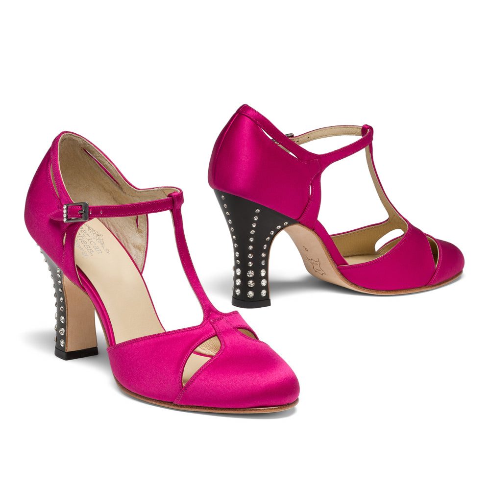 Be the life of the party in these extraordinary 1920s pumps. Marigold features a gorgeous, 3.5"/9 cm lacquered Spanish heel, sparkling with hand-inset graduated glass rhinestones. This shoe is resplendent with real silk uppers, in luxurious and elevated colors. Based on the lavishly decorated pumps from the Roaring 20s, Marigold is a sumptuous, one-of-a-kind shoe that is fit for dancing the night away. Please note that Marigold's uppers are real silk, and they should not be exposed to wet weather conditions. We don’t recommend the use of waterproofing sprays as they may result in light staining.