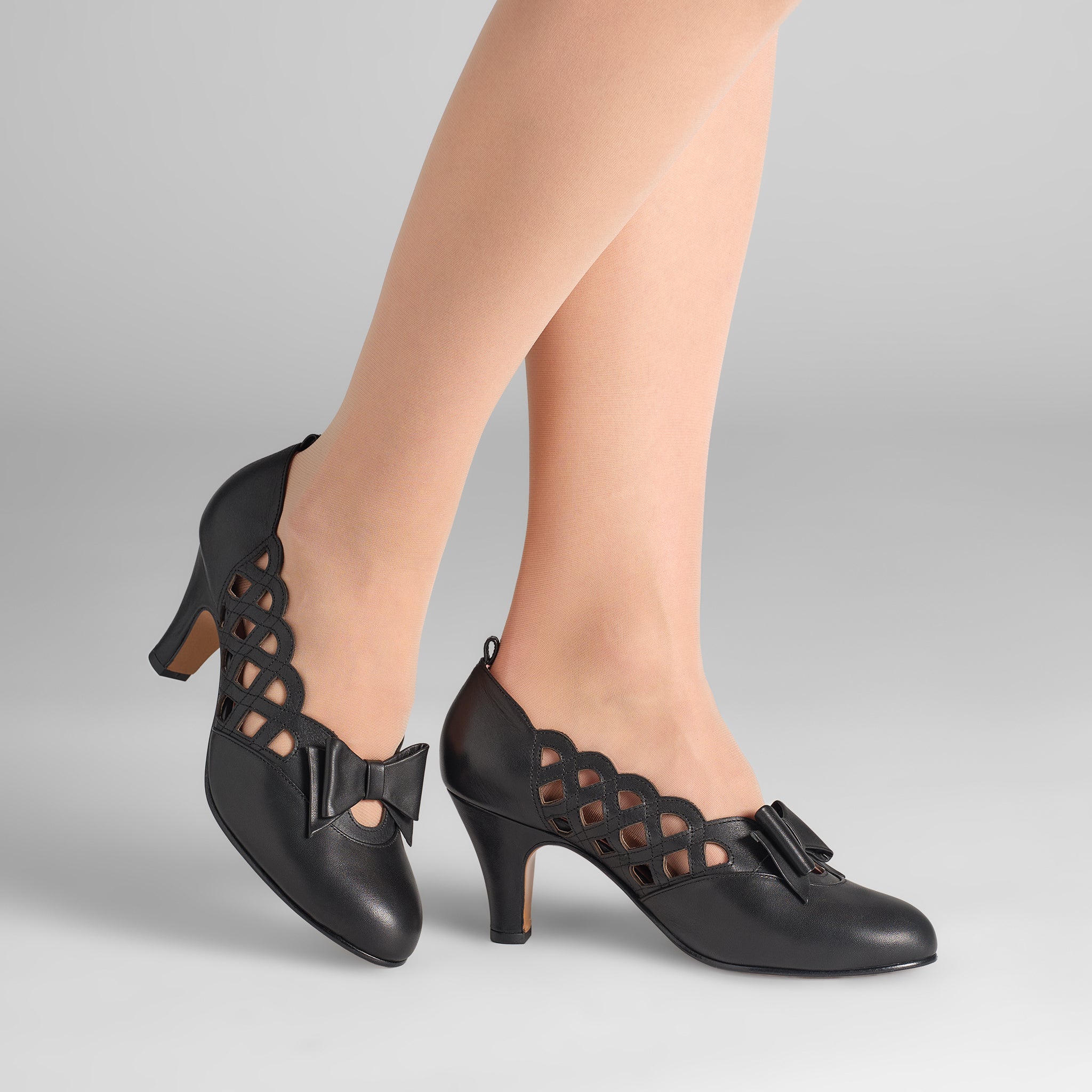 Meet Jessie, designed in collaboration with YouTuber Jessica Kellgren-Fozard from Jessica Out of the Closet! Based on original shoes from the 1940s, Jessie Pumps feature attractive lattice cut-outs, beautiful scalloped edges, and a decorative leather bow. Each pair of Jessies come with two removable leather ankle straps, to suit a wide variety of ankle sizes. Simply thread the strap through the tab on the back of the heel and fasten the quick-release buckle for days when you need some extra security, or just want to change up your look! Hidden elastic under the bow makes these step-in pumps easier to put on and remove. A rounded toe box and beautiful 3”/7.62 cm Spanish heel make Jessie perfect for 1940s-1950s ensembles.