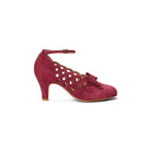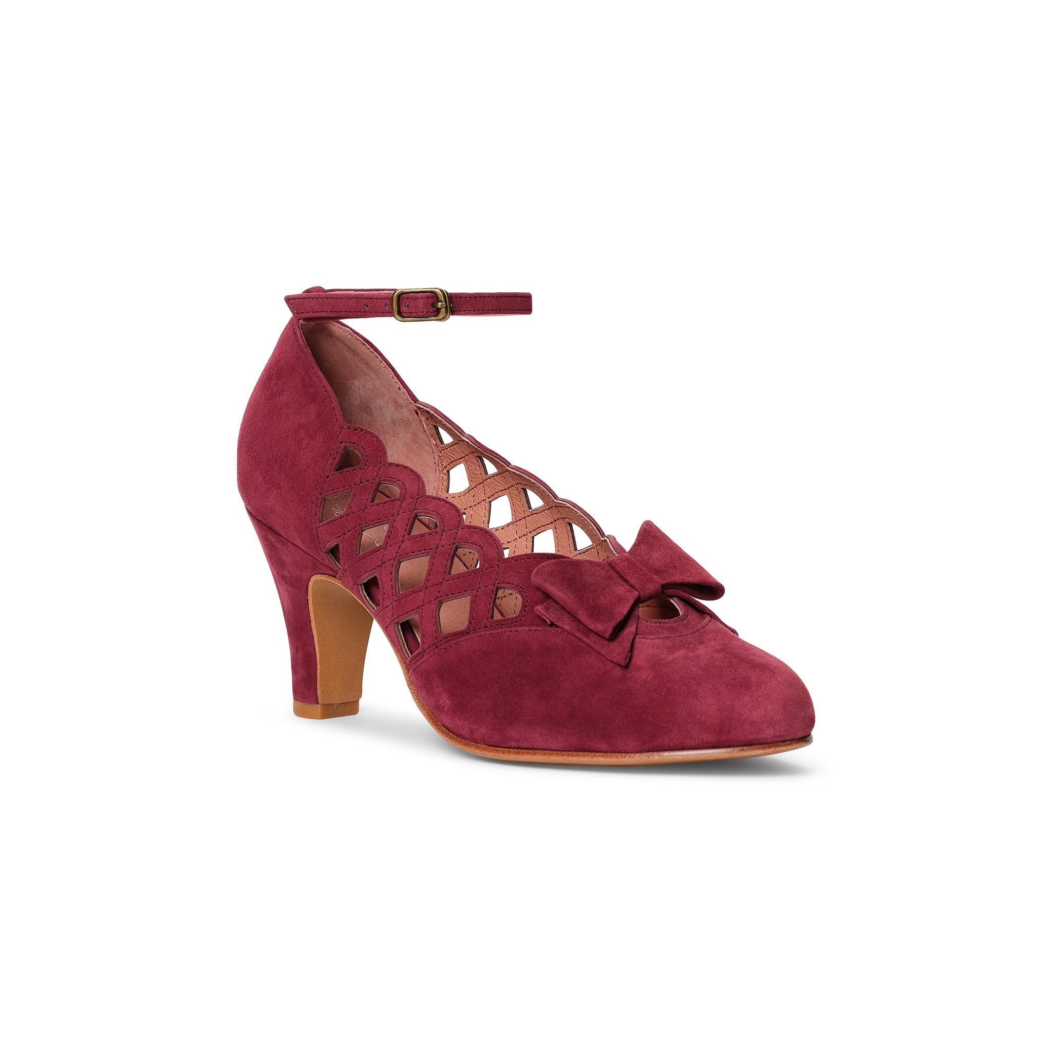 Meet Jessie, designed in collaboration with YouTuber Jessica Kellgren-Fozard from Jessica Out of the Closet! Based on original shoes from the 1940s, Jessie Pumps feature attractive lattice cut-outs, beautiful scalloped edges, and a decorative leather bow. Each pair of Jessies come with two removable leather ankle straps, to suit a wide variety of ankle sizes. Simply thread the strap through the tab on the back of the heel and fasten the quick-release buckle for days when you need some extra security, or just want to change up your look! Hidden elastic under the bow makes these step-in pumps easier to put on and remove. A rounded toe box and beautiful 3”/7.62 cm Spanish heel make Jessie perfect for 1940s-1950s ensembles.