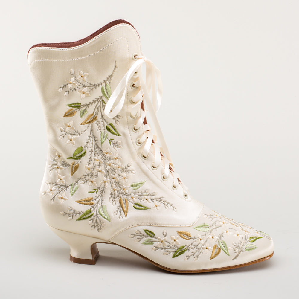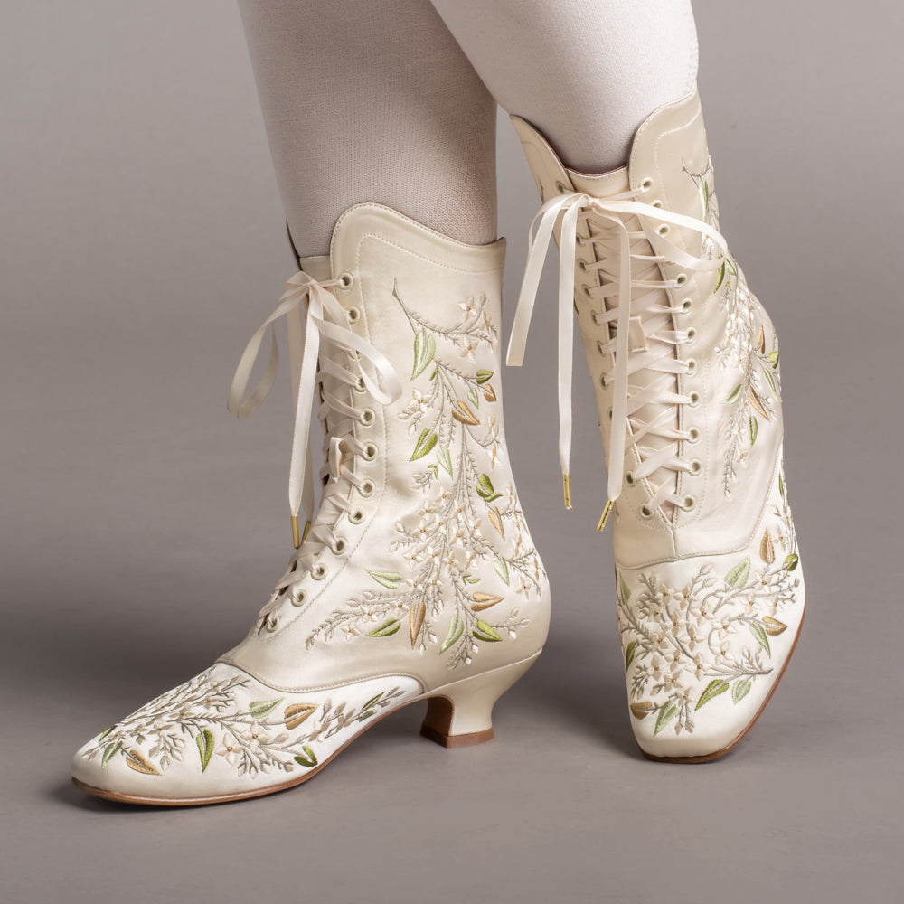 Indulge in a piece of history with Flora Embroidered Boots, an exclusive reproduction of the intricate opera and evening boots popular in the late Victorian period. Expertly crafted with intricate botanical detailing, these stunning satin boots will take you back to an era of sophistication and finesse. Wear them with bustle and Belle Epoque attire from the 1870s to c. 1900, or with modern dress as a statement piece.